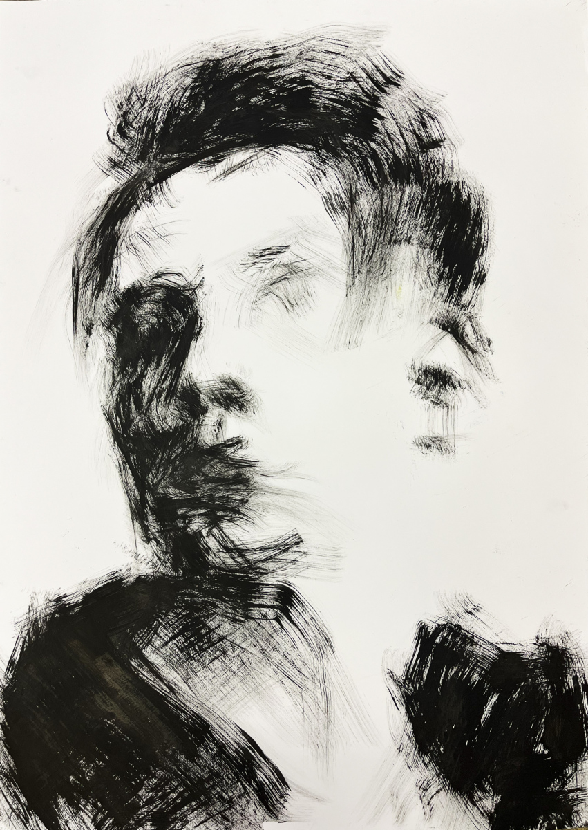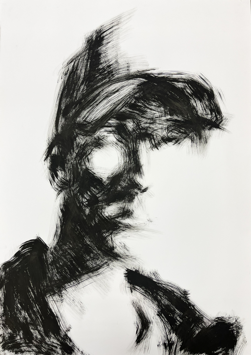 A series of spontaneous self-portraits made with ink and a paintbrush affixed to a 1 meter long handle.